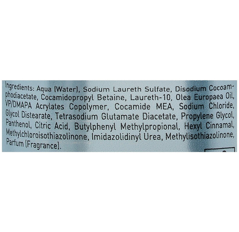 АКТИВНЫЕ КОМПОНЕНТЫ: Aqua (whater) - вода SODIUM LAURETH SULFATE – ПАВ - обладает очищающим, пенообразующим свойством. Сocamidopropyl betaine - ПАВ - обладает очищающим, пенообразующим свойством. Laureth -10- пенообразующий агент Olea Europaea Oil – Масло Оливы – увлажняет и питает волосы. Pаnthenol - Пантенол - это провитамин B5, эффективный увлажнитель. Обеспечивает быстрое и глубокое увлажнение кожи, уменьшает зуд и раздражение кожи. Выступает в качестве антистатика. Acrylates Copolymer - (акрилатный сополимер) - способен абсорбировать выделения кожи, тем самым снижая блеск кожи, и улучшая ее поверхность для нанесения косметики Cocamide MEA - мягкий ПАВ. Propilene glycol - растворитель, консервирующий компонент, смягчитель, ароматизатор, регулятор вязкости Hexyl Cinnamal - ароматизатор Parfum (Fragrance) - парфюм
