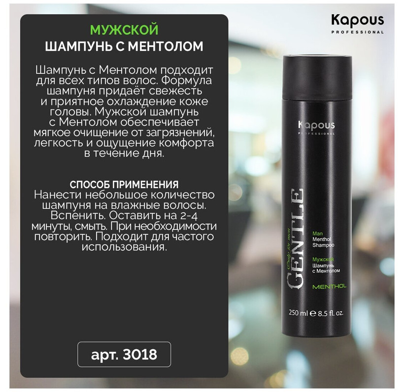 Мужской шампунь с ментолом серии "Gentlemen" Kapous, 250 мл подходит для всех типов волос. Формула шампуня придаёт свежесть и приятное охлаждение коже головы.