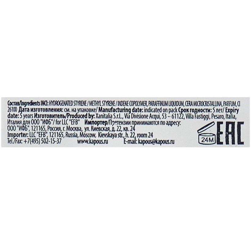 В состав воска входят такие компоненты, как гидрогенизированный стирол/инденовый сополимер, парафиновое масло, микрокристаллическая сера, ароматизатор и краситель CI 26100.