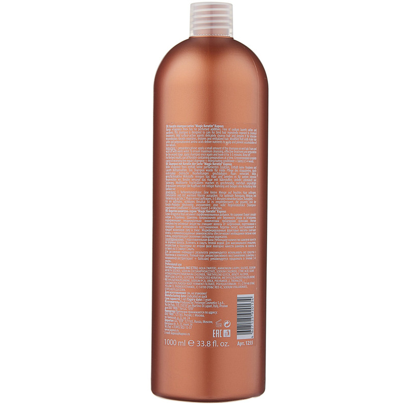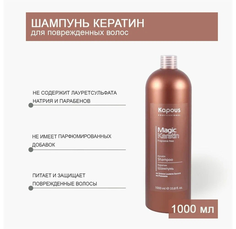 Шампунь "Magic Keratin" не содержит парабенов, ароматизаторов и сульфатов, что делает его гипоаллергенным и безопасным для ежедневного применения.