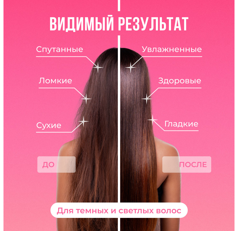 Благодаря формуле с эффектом шеллак-ламинирования, волосы становятся сильными, гладкими, блестящими и послушными. Снижается статика волос и излишняя пушистость.