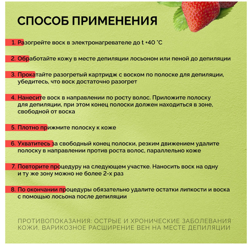 Поместите картридж в электронагреватель для воска; Разогрейте его до 40 градусов по Цельсию; Протрите зону эпиляции салфеткой, смоченной лосьоном; Не отключая воскоплав, нанесите тонкий слой воска по полоске для депиляции; Нанесите полоску с воском на кожу (по направлению роста волос), плотно прижимая ее к коже, но оставим небольшой участок с краю; Резким движением удалите полоску вместе с волосками (по направлению против роста волос); Не рекомендуется выполнять депиляцию на одном и том же участке, более 2-ух раз; Обработайте кожу средством после эпиляции.