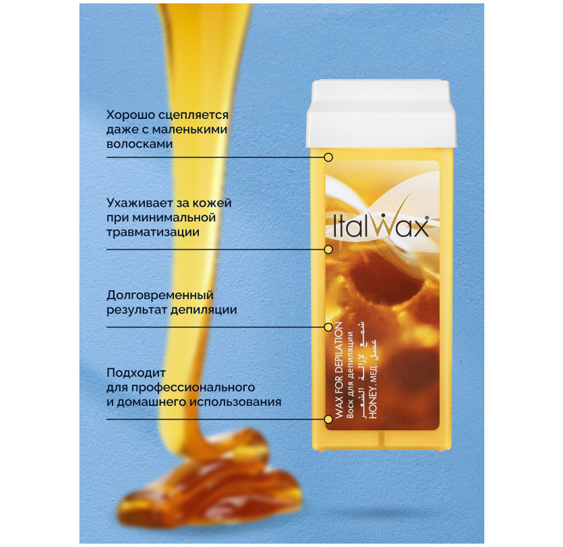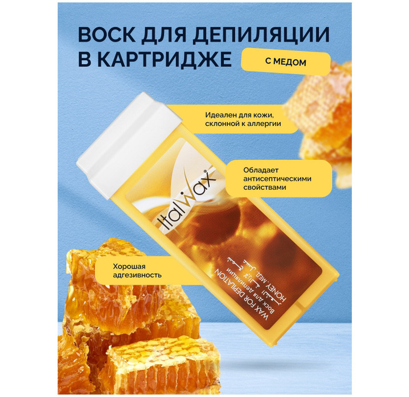 Воск ITALWAX в картридже Мед прозрачный воск предназначен для удаления тонких светлых волос на руках, ногах, бикини, спине, груди и подмышках.