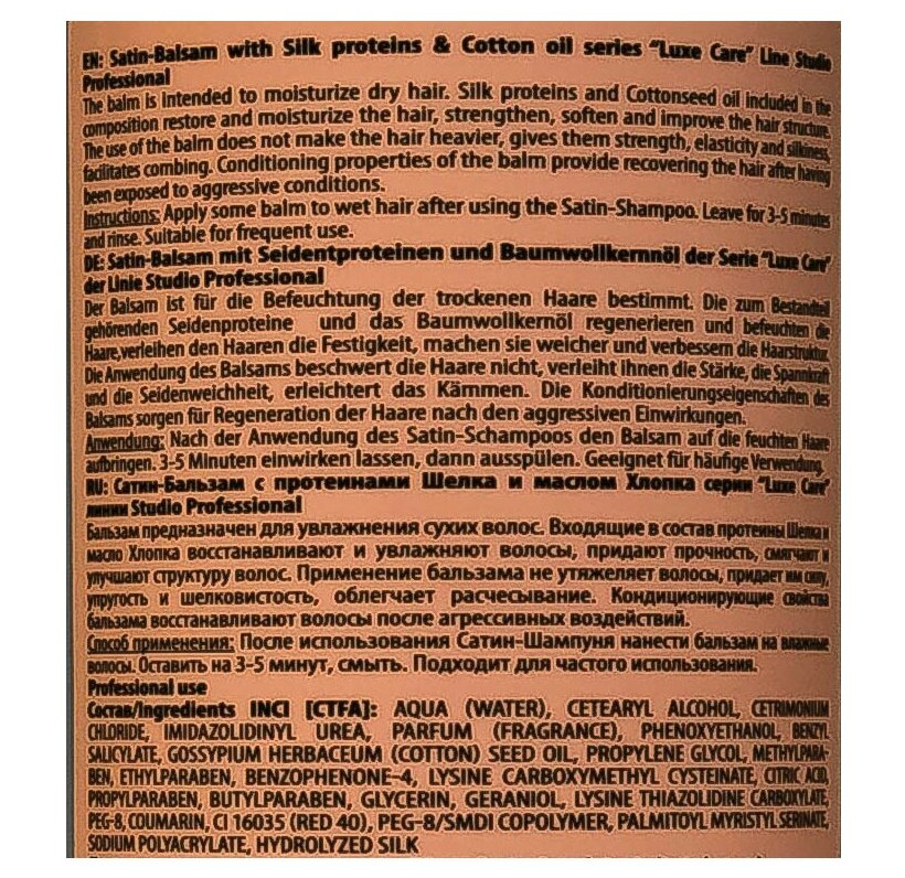 Сатин-Бальзам с протеинами шелка и маслом хлопка серии "Luxe Care" Studio Professional, 350 мл