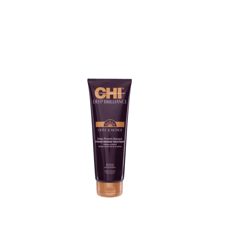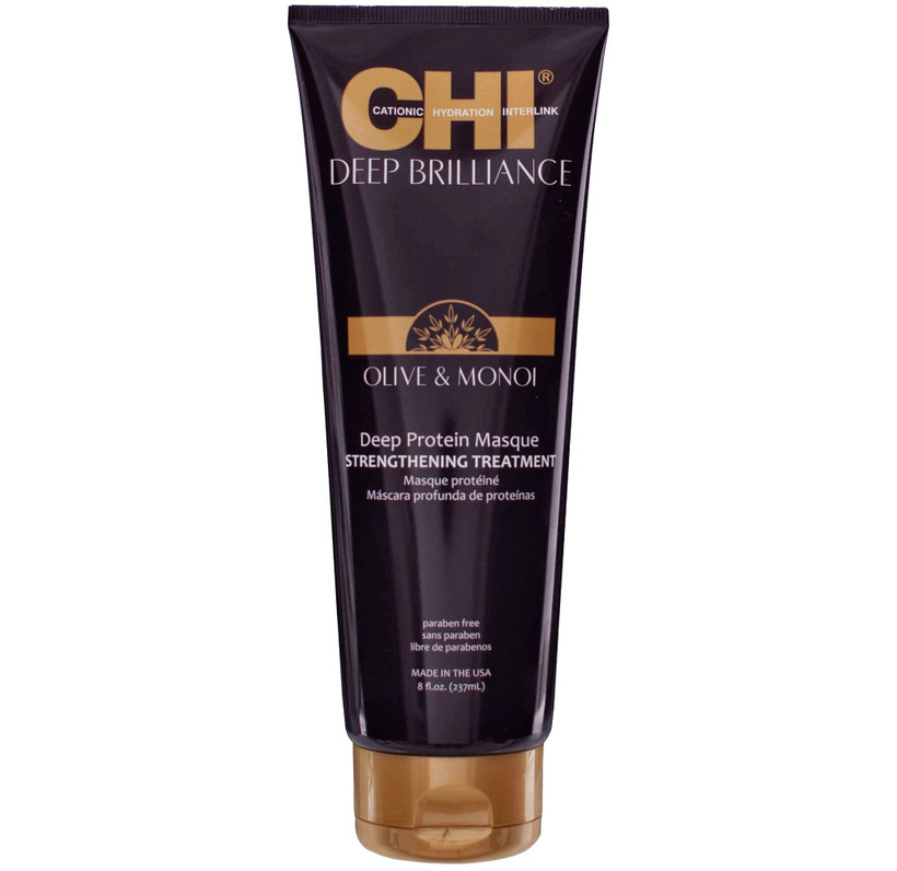 Маска CHI Deep Brilliance Deep Protein Masque 237 мл восстанавливает сухие поврежденные волосы при помощи смеси масла оливы, масла Ши и масла монои. Богатый протеином комплекс натуральных эфирных масел, витаминов, экстрактов растений и трав делает волосы мягче, крепче и послушнее.