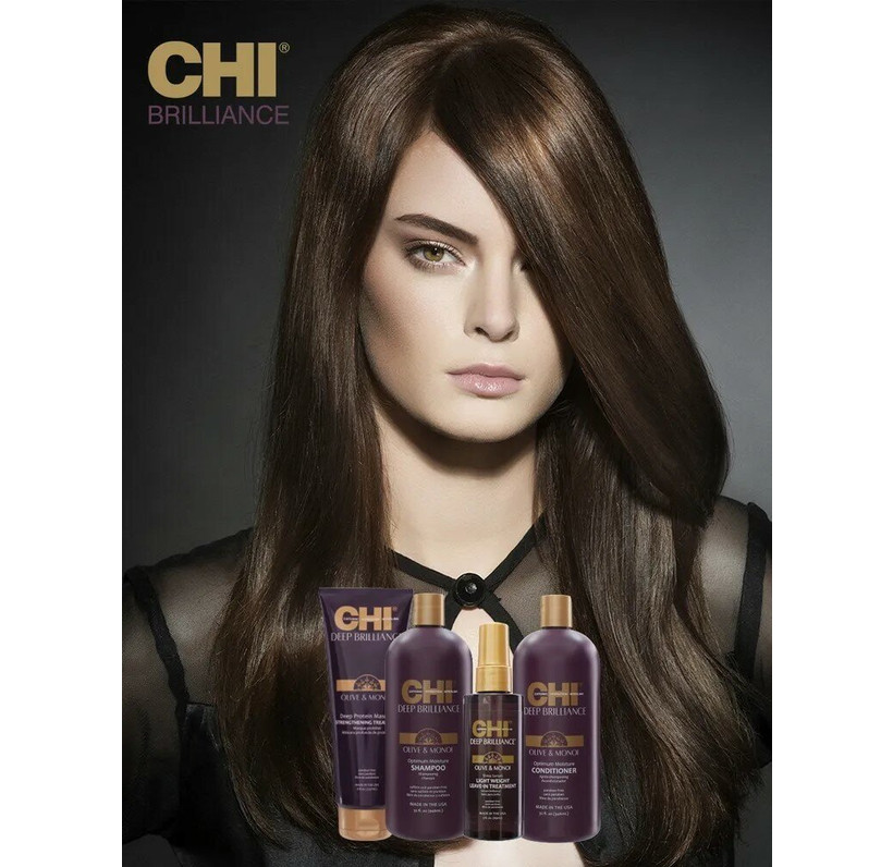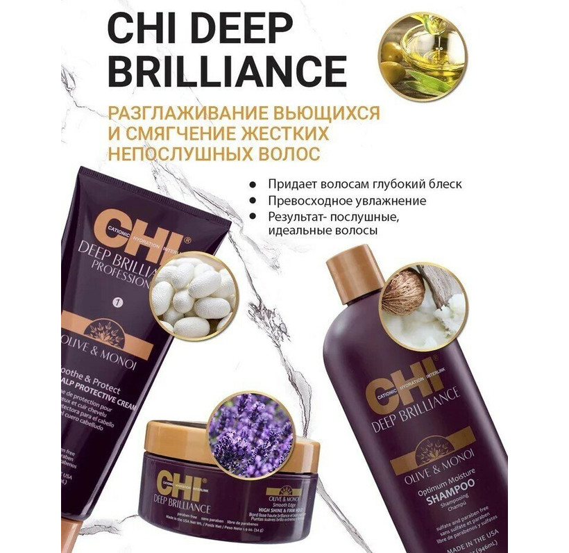 Маска CHI Deep Brilliance содержит оливковое масло, масло монои и экстракт гардении, которые увлажняют, смягчают и питают кожу головы.