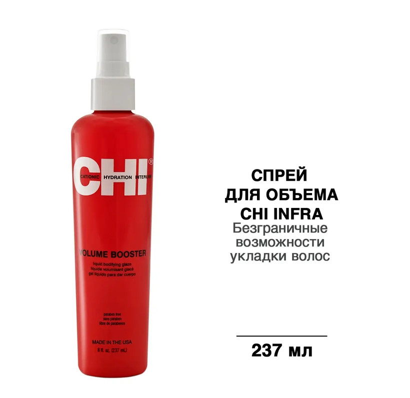 Спрей-блеск CHI Infra Volume Booster объемом 237 мл предназначен для придания волосам упругого объема и четкой укладки. Он может быть использован как для создания прикорневого объема, так и по всей длине волос для получения желаемой фиксации.