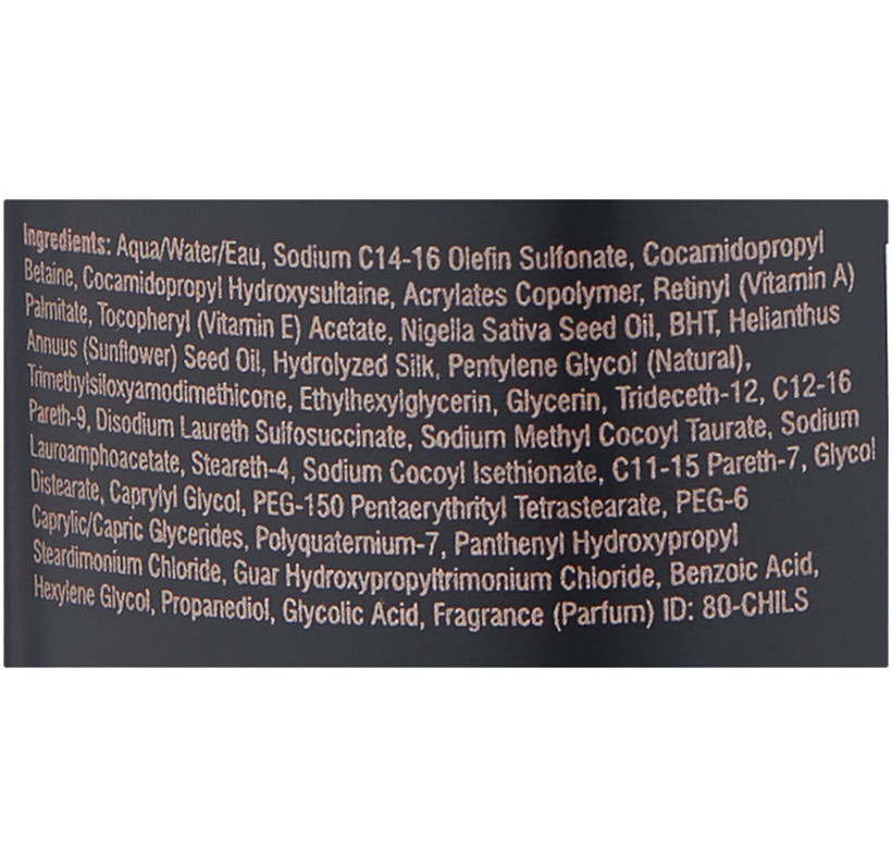 aqua/water/eau, sodium C14-16 olefin sulfonate, cocamidopropyl betaine, cocamidopropyl hydroxysultaine, acrylates copolymer, retinyl (vitamin A) palmitate, tocopheryl (vitamin E) acetate, Nigella sativa seed oil, BHT, Helianthus annuus (sunflower) seed oil, hydrolyzed silk, pentylene glycol (natural), trimethylsiloxyamodimethicone, ethylhexylglycerin, glycerin, trideceth-12, C12-16 pareth-9, disodium laureth sulfosuccinate, sodium methyl cocoyl taurate, sodium lauroamphoacetate, steareth-4, sodium cocoyl isethionate, C11-15 pareth-7, glycol distearate, caprylyl glycol, PEG-150 pentaerythrityl tetrastearate, PEG-6 caprylic/capric glycerides, polyquaternium-7, panthenyl hydroxypropyl steardimonium chloride, guar hydroxypropyltrimonium chloride, benzoic acid, hexylene glycol, propanediol, glycolic acid, fragrance (parfum)