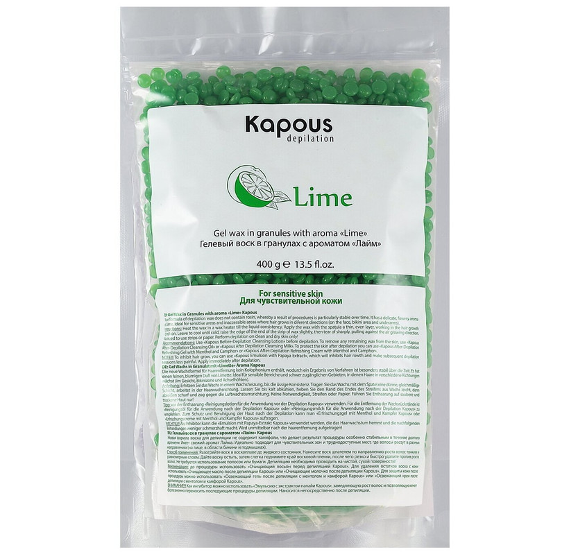 Объем воска составляет 400 грамм, что позволяет использовать его на протяжении длительного времени. Выбирая гелевый воск Kapous в гранулах с ароматом "Лайм", вы получаете профессиональное средство для восковой эпиляции, которое обеспечивает эффективное удаление волос, комфорт и заботу о коже.