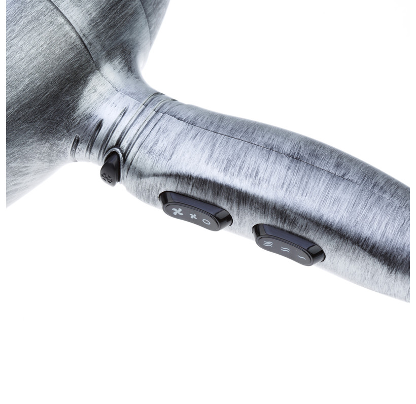 Фен обладает стильным матовым покрытием корпуса, имитирующим сталь, и весит всего 570 грамм. Ручка фена немного отклонена назад, что улучшает эргономику при работе. Сопла скошенной формы увеличивают скорость воздушного потока и делают процесс укладки брашингом более комфортным.