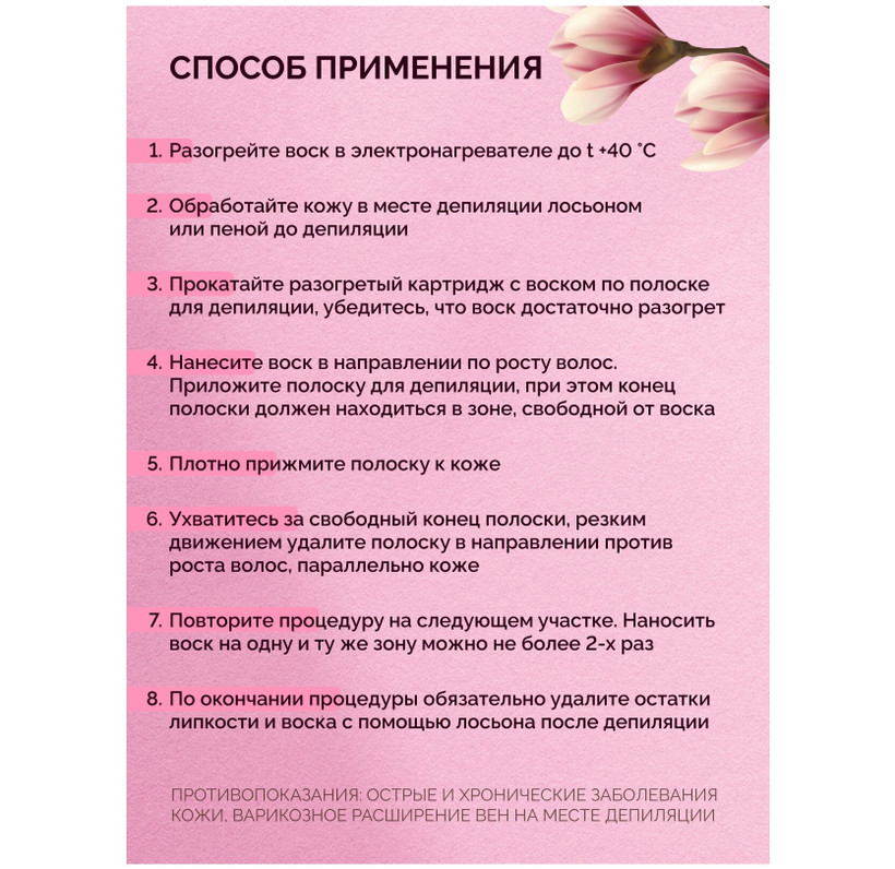 Аромат воска - магнолия, что придает процедуре приятный и расслабляющий эффект.