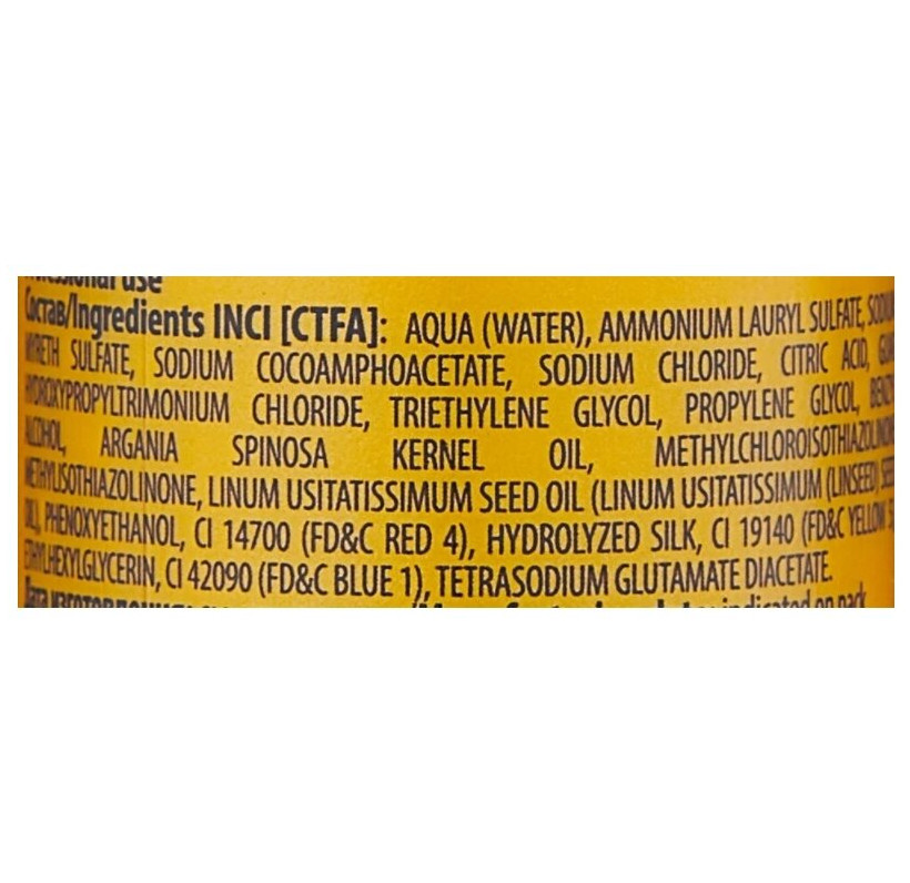 Aqua (Water), Ammonium Lauryl Sulfate, Sodium Myreth Sulfate, Sodium Cocoamphoacetate, Sodium Chloride, Citric Acid, Guar Hydroxypropyltrimonium Chloride, Triethylene Glycol, Propylene Glycol, Benzyl Alcohol, Argania Spinosa Kernel Oil, Linum Usitatissimum Seed Oil (Linum Usitatissimum (Linseed) Seed Oil), Methylchloroisothiazolinone Methylisothiazolinone, Magnesium Chloride, Magnesium Nitrate, Phenoxyethanol, CI 14700 (FD&C RED 4), Hydrolyzed Silk, CI 19140 (FD&C YELLOW 5), Ethylhexylglycerin, CI 42090 (FD&C BLUE 1), Tetrasodium Glutamate Diacetate