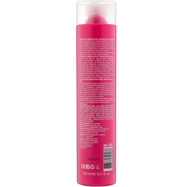 Бальзам для прямых волос Kapous "Smooth and Curly" - это профессиональное средство для ухода за волосами, разработанное специально для "непослушных" прямых волос. Продукт предназначен для ежедневного использования и подходит для всех типов волос, включая нормальные, сухие, жирные у корней и сухие на кончиках.
