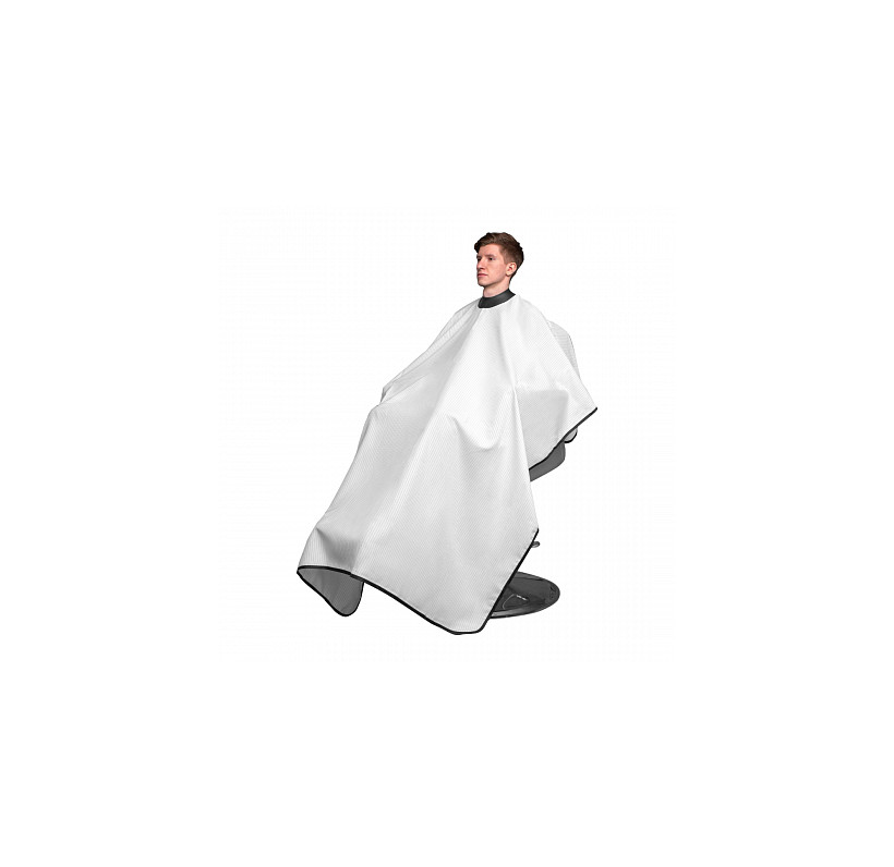 Этот пеньюар отличается от прочих специальной защитой шеи, которая сделана из высококачественного неопрена, который защищает шею от попадания волос, воды и прочих нежелательных раздражителей. Благодаря увеличенной длине (200 см) этот пеньюар закрывает и ноги, и ступни клиента, защищая их от волос и воды, пока клиент сидит. Удобный приятный на ощупь пеньюар подходит мужчинам и женщинам. Изготовлен из премиальной ткани, сделанной на заказ, в чистом белом цвете и украшен классическими винтажными полосами. Ткань — 100% уплотненный полиэстер.