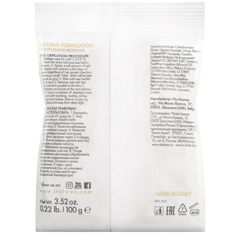 Особенностью воска является его пленочная формула. Это позволяет удалить волосы с корнем, обеспечивая долгосрочный эффект.