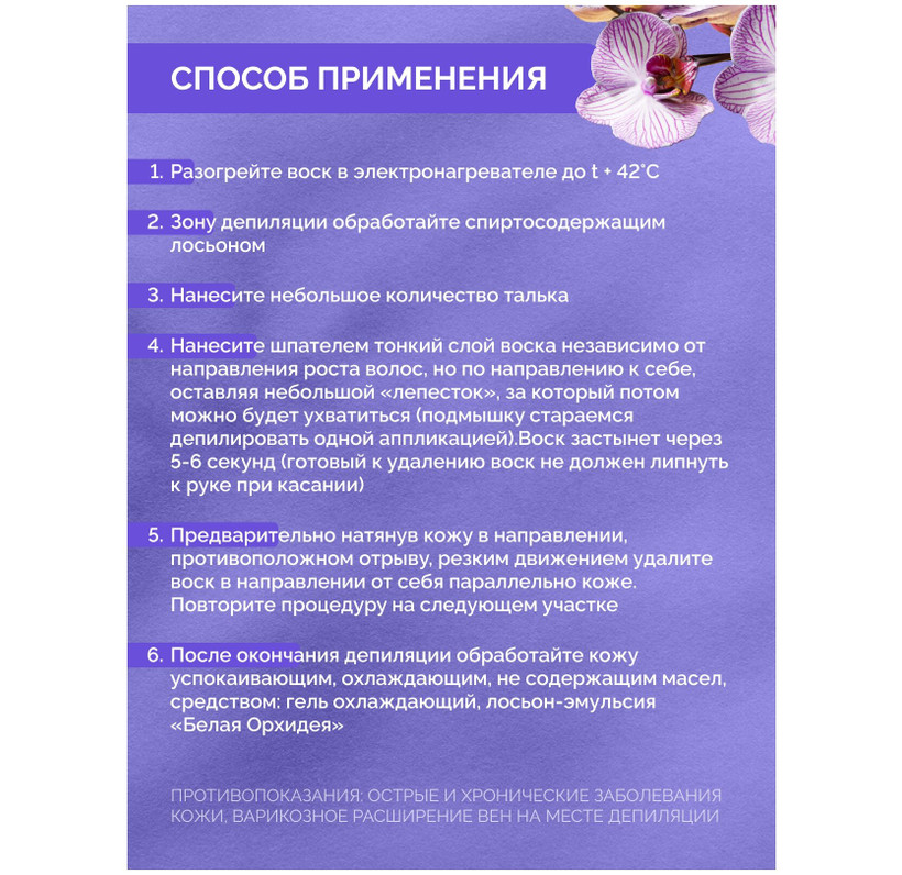 Воск обладает полупрозрачной мягкой текстурой и нежным цветочным ароматом орхидеи, делая процесс эпиляции приятным и комфортным для пользователя. Продукт не тестируется на животных и прошел дерматологическое тестирование, гарантируя безопасность и эффективность использования воска для всех типов кожи и волос.