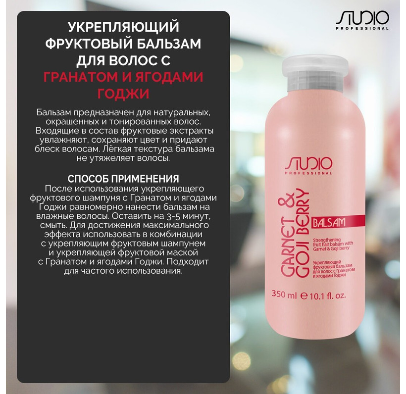Выбирая укрепляющий фруктовый бальзам для волос с Гранатом и ягодами Годжи линии Studio Professional, вы получаете профессиональный уход за волосами, который обеспечивает увлажнение, сохранение цвета и придание блеска, а также укрепление, питание и эластичность.