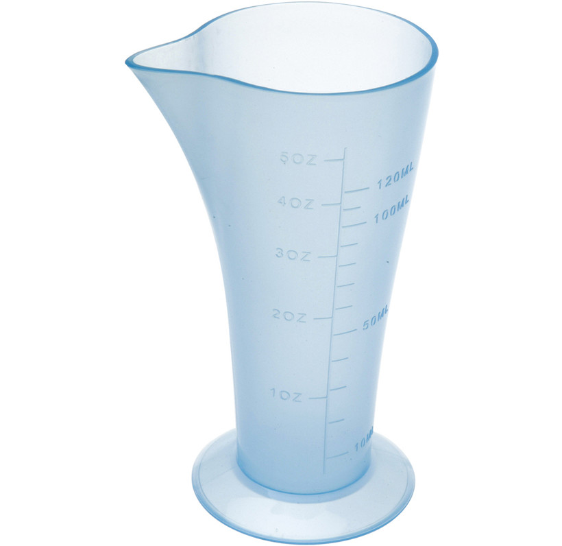 Стакан для лёгкого и точного измерения компонентов рабочих растворов при окрашивании изготовлен из высокопрочного полупрозрачного пластика, с нежным голубым оттенком.