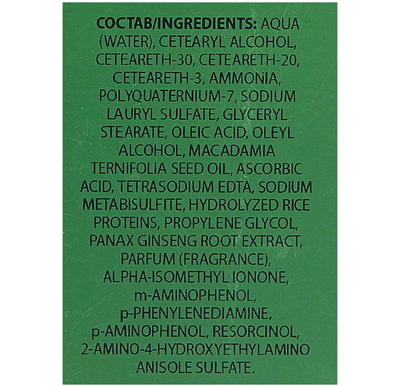 aqua (water), cetearyl alcohol, ceteareth-30, ceteareth-20, ceteareth-3, ammonia, polyquaternium-7, sodium lauryl sulfate, glyceryl stearate, oleic acid, oleyl alcohol, macadamia ternifolia seed oil, ascorbic acid, tetrasodium edta, sodium metabisulfite, hydrolyzed rice proteins, propylene glycol, panax ginseng root extract, parfum (fragrance), alpha-isomethylionone, m-aminophenol, p-phenylenediamine, p-aminophenol, resorcinol, 2-amino-4-hydroxyethylaminoanisole sulfate