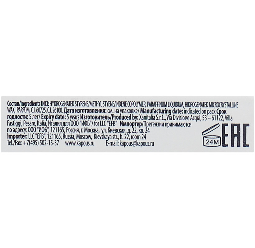 В состав воска входят такие компоненты, как гидрогенизированный стирол/инденовый сополимер, минеральное масло, микрокристаллическая сера, парфюм, линалоол и CI 60725. Экстракт алоэ вера, входящий в состав воска, успокаивает и увлажняет кожу, предотвращая раздражение и сухость.