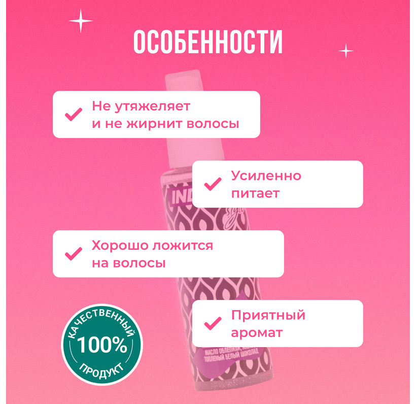 Масло амлы, входящее в состав флюида, обеспечивает максимальное питание и увлажнение волос, придавая им гладкость, шелковистость и обворожительный блеск. Масло облепихи, богатое витаминами и микроэлементами, защищает и укрепляет волосы, а топленный белый шоколад делает их сильнее, стимулирует рост, уменьшает ломкость и выпадение.