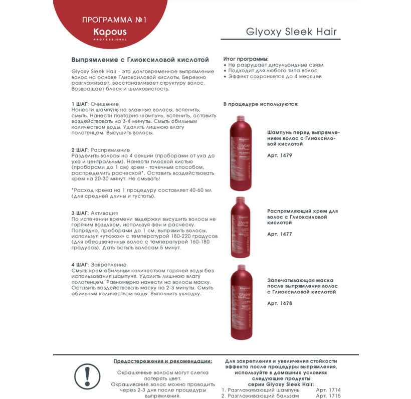 предварительно подготовить волосы, используя шампунь для выпрямления волос Pre-shampoo with glyoxylic acid. Подсушить волосы на 70%. Нанести распрямляющий крем попрядно на волосы, тщательно расчесать. Оставить крем воздействовать на волосах на 20-30 минут, далее высушить волосы феном, используя расческу. Протянуть попрядно волосы «утюжком» с температурой 180-220˚С. Смыть крем без использования шампуня. Нанести запечатывающую маску Sealing mask with glyoxylic acid. Смыть обильным количеством воды. Выполнить укладку.