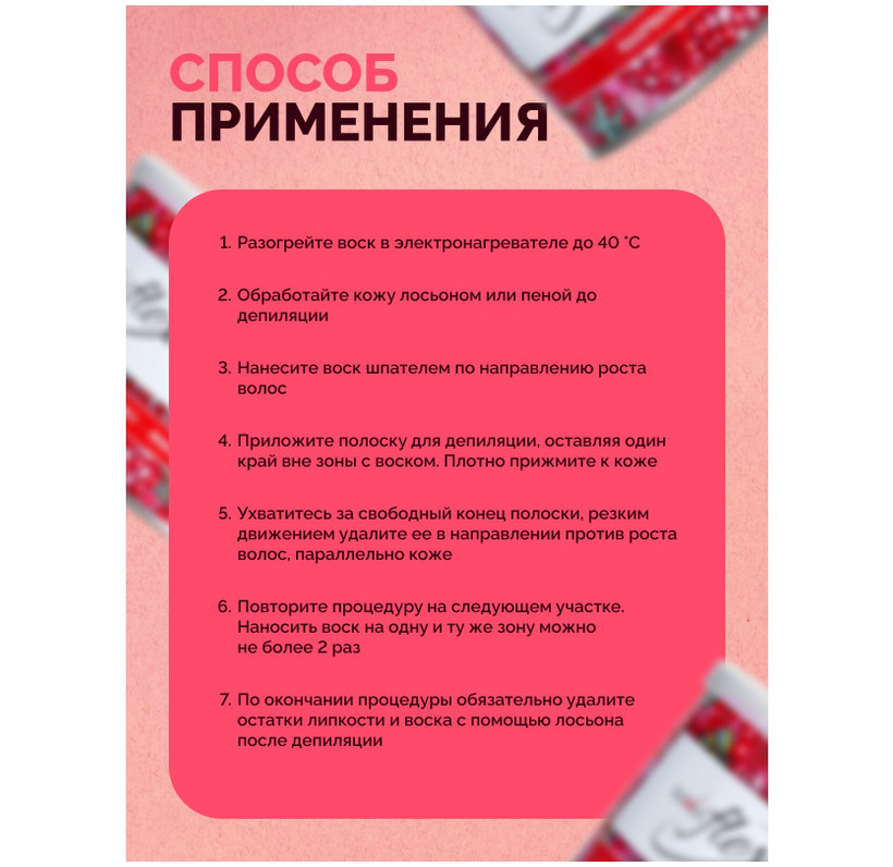 Разогрейте воск в электронагревателе до 42 °C. Обработайте кожу лосьоном или пеной до депиляции. Нанесите воск шпателем по направлению роста волос. Приложите полоску для депиляции, оставляя один край вне зоны с воском. Плотно прижмите к коже. Ухватитесь за свободный конец полоски, резким движением удалите ее в направлении против роста волос, параллельно коже. Повторите процедуру на следующем участке. Наносить воск на одну и ту же зону можно не более 2 раз. По окончании процедуры обязательно удалите остатки липкости и воска с помощью лосьона после депиляции.