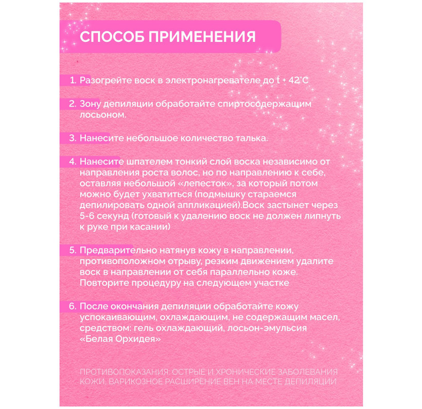1. Разогрейте воск в нагревателе до температуры 38-40 градусов Цельсия 2. Зону депиляции обработайте специальным лосьоном до депиляции. 3. Нанесите небольшое количество талька. 4. Возьмите шпателем необходимое количество воска и нанесите независимо от направления роста волос. Плотно прижимайте шпатель к коже, стараясь захватить все волоски. Используйте узкий шпатель. 5. Выведите конец восковой аппликации на зону с меньшим количеством волосков. 6. Приподнимите кончик аппликации над кожей, чтобы за него потом можно было ухватиться. 7. Через 5- 6 секунд убедитесь, что воск застыл. 8. Зафиксируйте кожу в месте отрыва. 9. Возьмитесь за кончик аппликации и резким движением удалите воск в направлении противоположном нанесению. 10. Повторите процедуру на следующем участке. 11. После окончания депиляции обработайте кожу успокаивающим средством.