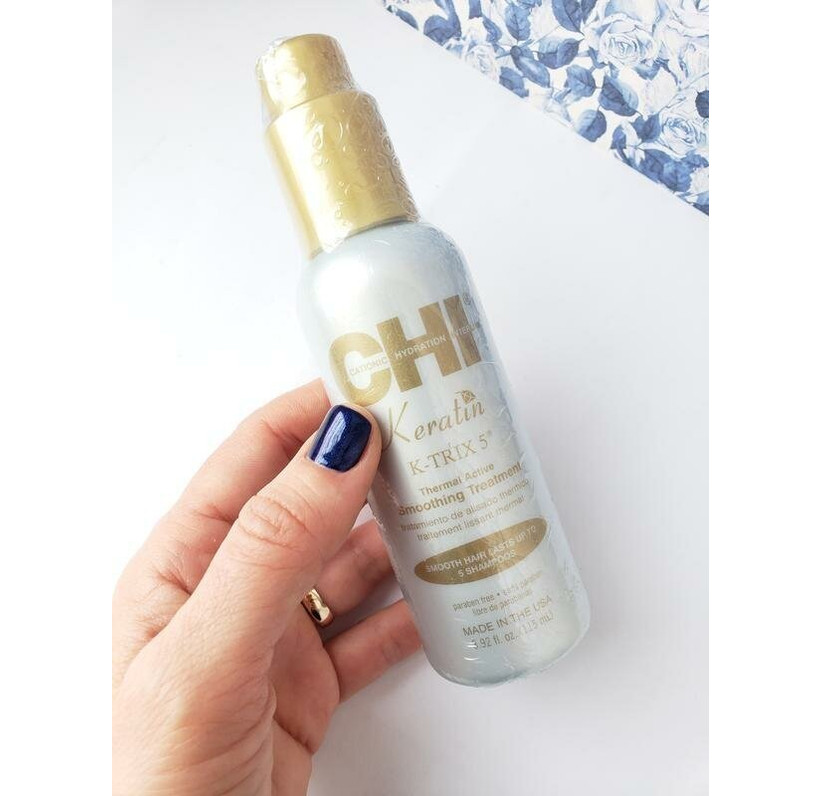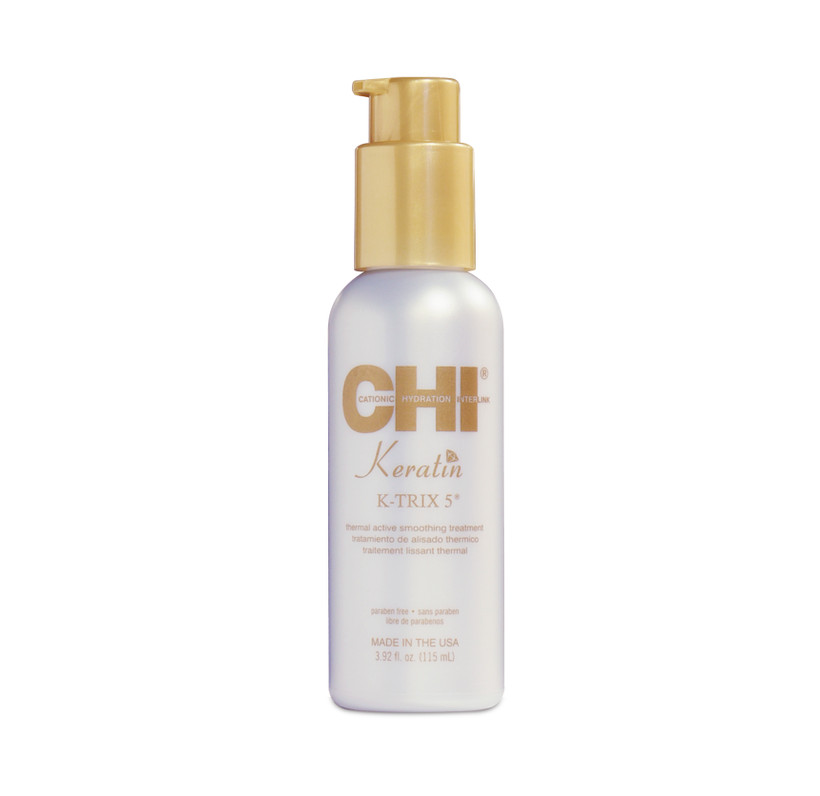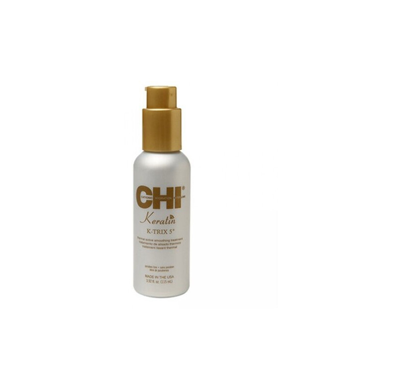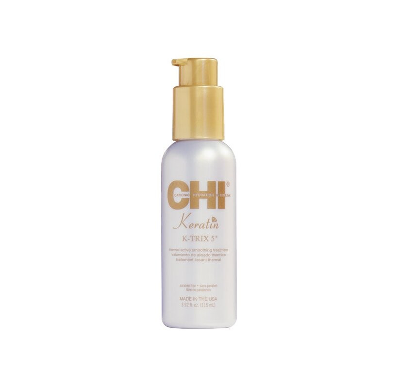CHI KERATIN K-TRIX 5 разглаживающая эмульсия для волос с кератином, 115 мл, представляет собой профессиональное средство для ухода за волосами, разработанное в США. Эта сыворотка предназначена для всех типов волос и подходит для вьющихся волос.