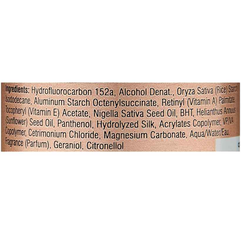 Hydrofluorocarbon 152a, Alcohol Denat., Oryza Sativa (Rice) Starch, Isododecane, Aluminum Starch Octenylsuccinate, Retinyl (Vitamin A) Palmitate, Tocopheryl (Vitamin E) Acetate, Nigella Sativa Seed Oil, BHT, Helianthus Annuus (Sunflower) Seed Oil, Panthenol, Hydrolyzed Silk, Acrylates Copolymer, VP / VA Copolymer, Cetrimonium Chloride, Magnesium Carbonate, Aqua / Water / Eau, Fragrance (Parfum), Geraniol, Citronellol