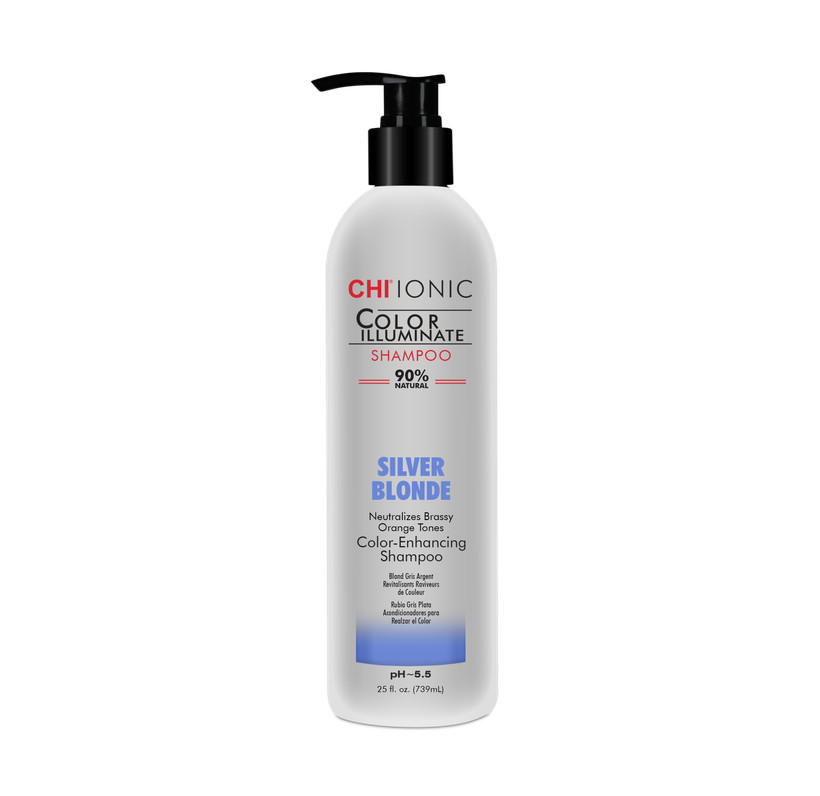 Нейтрализация нежелательных оттенков: Шампунь CHI IONIC COLOR ILLUMINATE Серебристый блондин специально разработан для нейтрализации нежелательных золотистых и медных оттенков на светлых волосах. Он рекомендуется к применению для волос с 6 по 10 уровень глубины тона (УГТ).