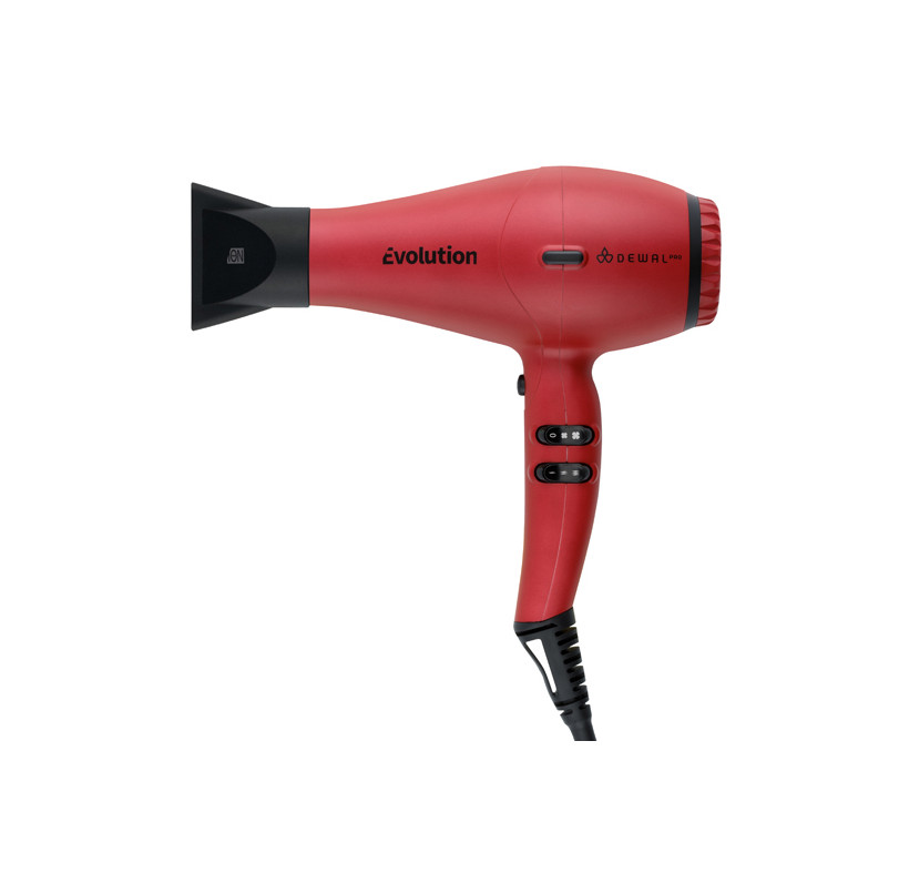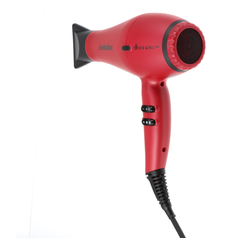 Профессиональный фен DEWAL PRO EVOLUTION мощностью 2300 Вт и красным матовым покрытием корпуса.