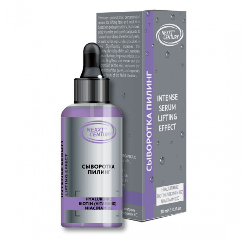 Сыворотка для лица пилинг INTENSE SERUM LIFTING EFFECT NEXXT CENTURY 30 мл - интенсивная профессиональная концентрированная сыворотка для лифтингового ухода за кожей лица и шеи на основе полисахаридов, гиалуроновой кислоты, витаминов и полезных растений. Применяется для пролонгации эффекта пилингов, а также для регулярного ежедневного ухода за кожей лица. Значительно повышает плотность, эластичность кожи, снимает следы усталости, улучшает микроциркуляцию. Осветляет и выравнивает микрорельеф кожи, улучшает состояние пор, улучшает контуры овала лица.