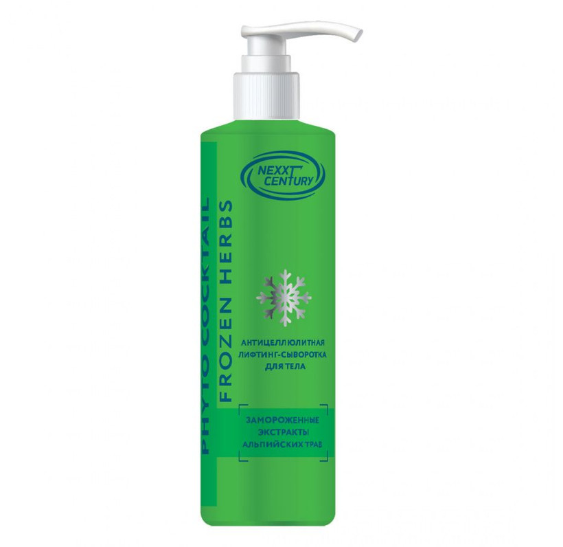 Антицеллюлитная лифтинг-сыворотка для тела PHYTO COCKTAIL NEXXT CENTURY 200 мл - интенсивная крио-сыворотка (замороженные лечебные травы) обладает жиросжигающим, антицеллюлитным и укрепляющим действием на кожу. Натуральные экстракты растений и масла способствуют похудению. Жасминовый экстракт тонизирует кожу, смягчает ее и стабилизирует работу желез. Экстракт полыни имеет высокие антиокислительными свойствами, сравнимыми со свойствами чистого витамина С. Благоприятно действует на кожу любого типа, оказывает защитное и регенерирующее действие. Экстракт эдельвейса идеален для чувствительной, и подверженной стрессу, стареющей кожи, для предотвращения окислительных процессов, в результате которых образуются свободные радикалы. Благодаря содержанию полисахаридов и минералов выравнивает рельеф кожи, препятствуя образованию целлюлита. Экстракт люцерны полевой обладает очень широким спектром действия. Это антиоксидант - питает кожу необходимыми витаминами и микроэлементами, ускоряет обменные процессы в коже.