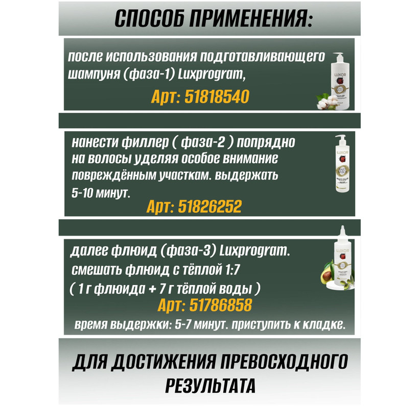 После использования Филлера для заполнения структуры волос серии Luxprogram (Фаза 2) подсушить волосы полотенцем. Смешать флюид-закрепитель с теплой водой в пропорции 1:7 (1 г флюида-закрепителя + 7 г теплой воды) до кремовой консистенции. Получившийся крем нанести попрядно на волосы, уделяя внимание поврежденным участкам. Время выдержки: 5-7 минут. Использование дополнительного тепла увеличит эффект процедуры. Смыть. Приступить к укладке.