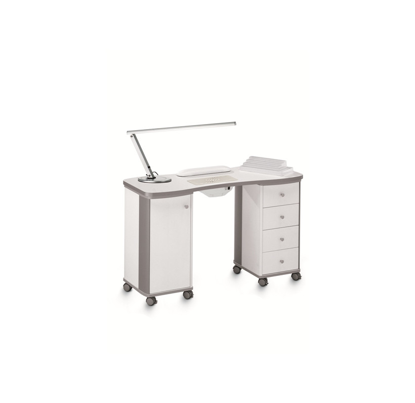 Маникюрный стол с двумя тумбами, столешница и тумбы из дерева. Тумбы маникюрного стола имеют серые вставки, кромка столешницы серого цвета. Одна тумба маникюрного стола оснащена четырьмя выдвижными ящиками, другая тумба оснащена распашной дверцей и полками. Тумбы маникюрного стола имеют колеса со стопорами для удобства перемещения. В комплекте: валик маникюрный, подставка под лаки, вытяжка AR1 20W.