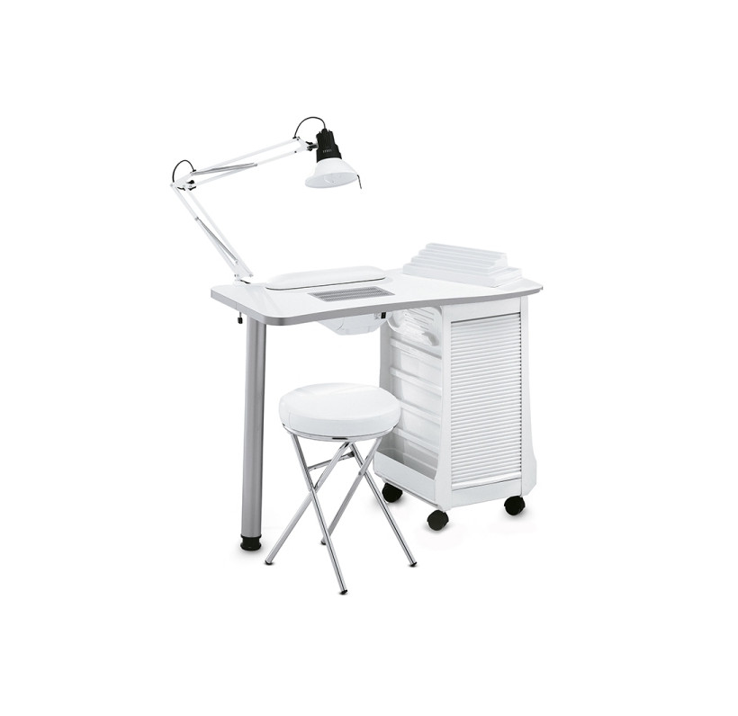 Маникюрный стол с одной тумбой, столешница из дерева, тумба из пластика. Кромка столешницы серого цвета. Опорная нога серая глянцевая. Тумба маникюрного стола оснащена четырьмя выдвижными ящиками, закрывающейся пластиковой шторкой и колесами для удобства перемещения. В комплекте: валик маникюрный, подставка под лаки, вытяжка AR1 20W.