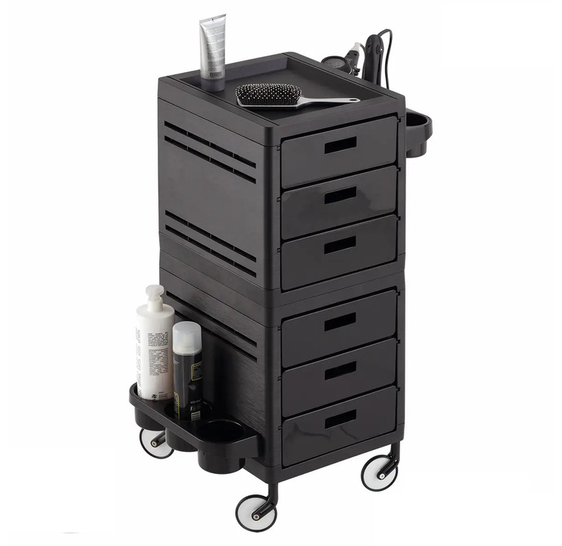 Тележка парикмахерская закрытого типа на бесшумных колесиках "NO HAIR". Тележка выполнена из прочного пластика. Тележка оснащена выдвижными ящиками и съемными боковыми полками.
