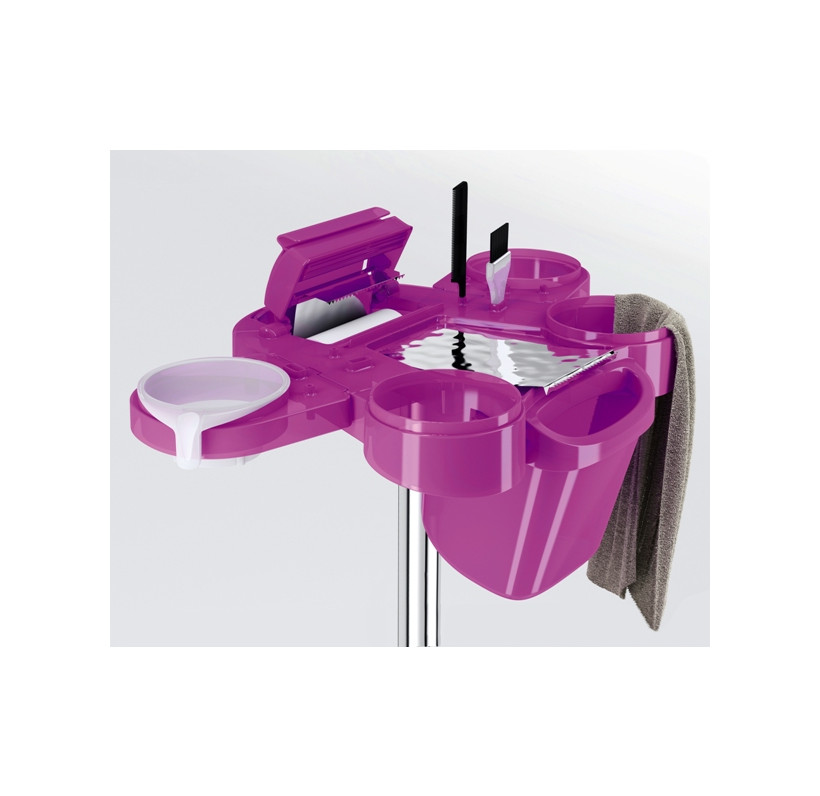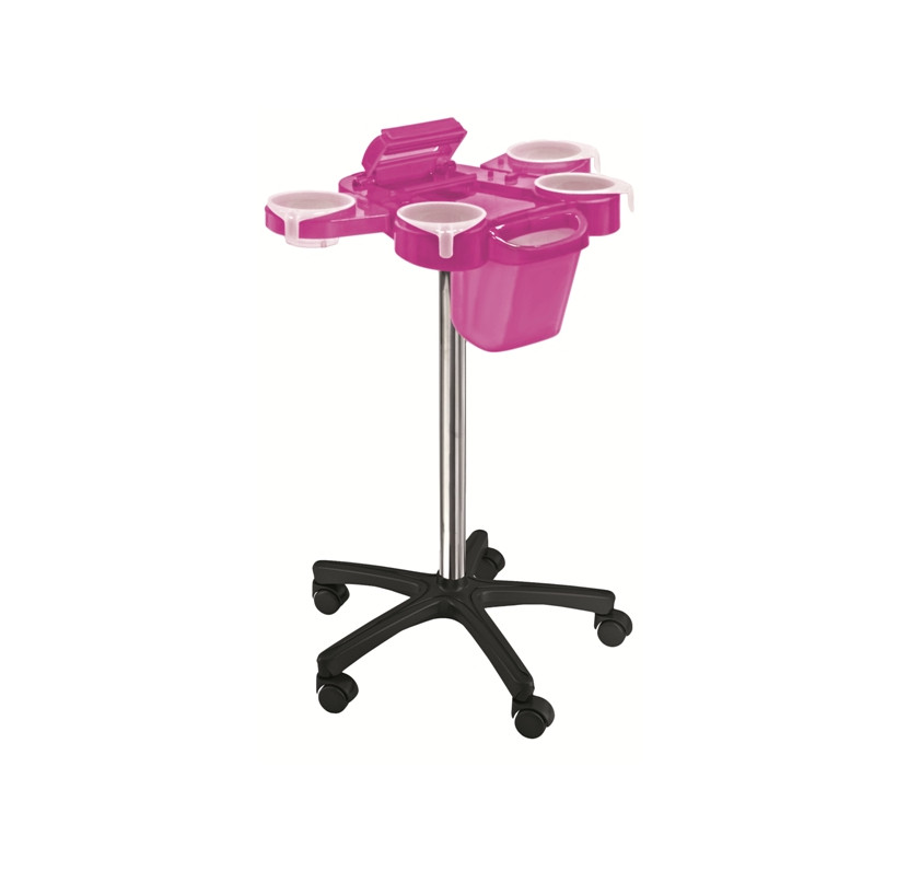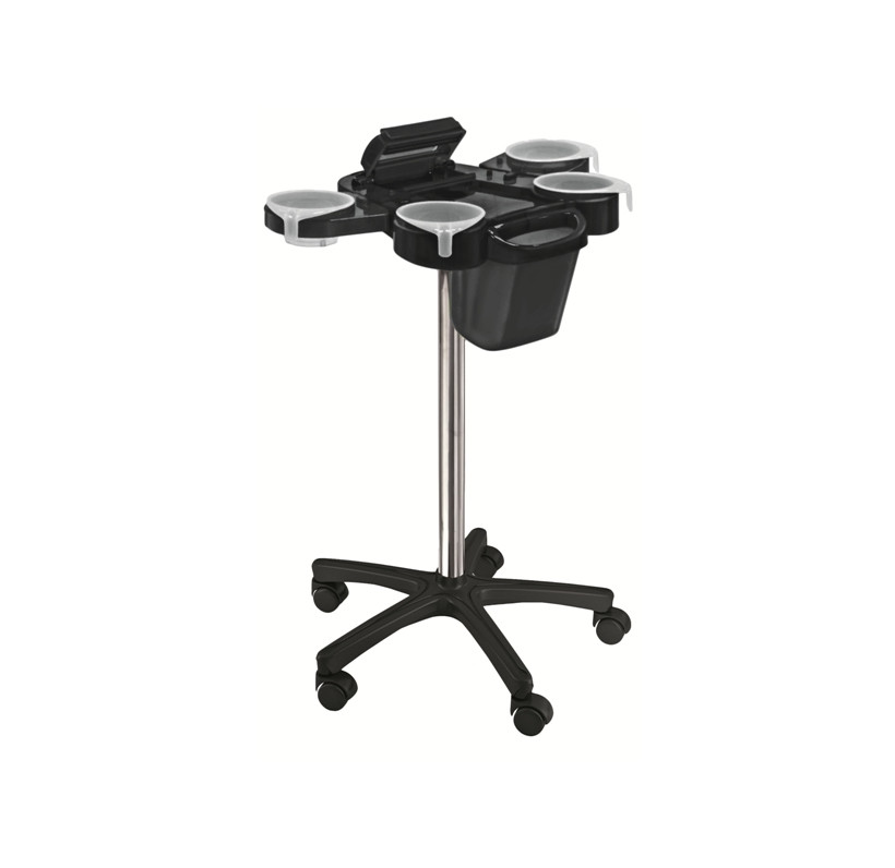 Тележка для окрашивания на колесиках. Тележка выполнена из прочного пластика. Тележка оснащена специальными углублениями под чаши и аксессуары для окрашивания, основанием на стойке с черным пластиковым пятилучьем.
