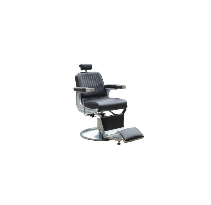 Классическое барбер-кресло c удобными мягкими подлокотниками с металлическими наконечниками и широкой спинкой.