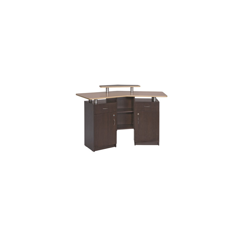 Стойка администратора изготовлена из ламинированного ДСП. Оснащена выдвижной полкой для клавиатуры и двумя тумбами.