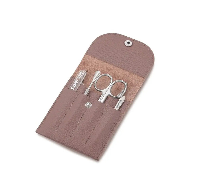 MH-05-7 Набор, чехол кофейный, натуральная кожа, 5 предмета, на кнопке SILVER STAR. Комплект из 5 предметов: кусачки маникюрные ножницы маникюрные шабер маникюрный пинцет для бровей пилка для ногтей. Упакован в футляр из натуральной кожи ручной работы. Все инструменты профессионально заточены и прошли трехкратную проверку качества.