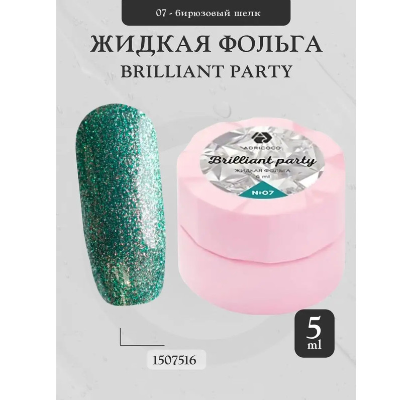 Жидкая фольга для ногтей Brilliant party № 07 Бирюзовый шелк – это профессиональная косметика для маникюра и педикюра, которая придает ногтям блестящий металлический эффект. Средство представлено в цветной баночке и содержит блестки, которые при нанесении на ногти создают эффект слюды. Фольга обладает светоотражающим свойством, что добавляет дизайну яркий блеск. Применение жидкой фольги для ногтей позволяет быстро и легко создать авторский дизайн. Средство легко ложится на ногти, обеспечивая плотное покрытие с максимальным блеском. После высыхания фольга прочно держится на ногтях, сохраняя яркость цвета и блеск. Жидкая фольга подходит для любого цвета лака и гельлака, обеспечивая эффектный дизайн. Это универсальное средство для создания как повседневного, так и праздничного маникюра и педикюра. Фольгу можно использовать в качестве самостоятельного декора на ногтях или комбинировать с другими маникюрными элементами. Жидкая фольга для ногтей – это современное средство для создания эксклюзивного дизайна, которое позволяет выразить свою индивидуальность и добавить яркие акценты в образ.