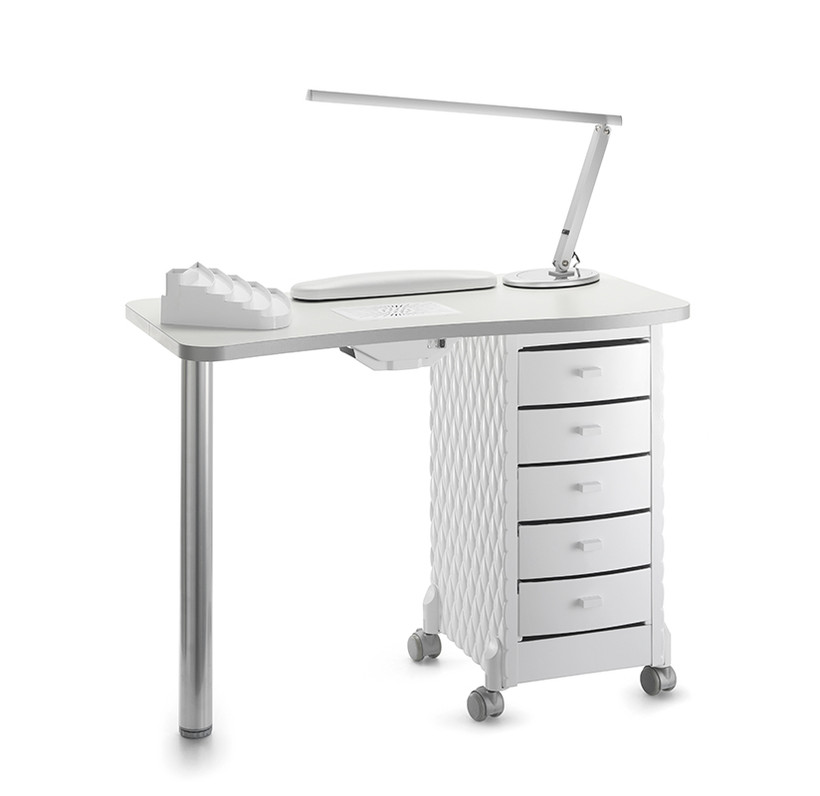 Маникюрный стол с одной тумбой, столешница ламинированная, тумба из прочного пластика с декоративной стеганой отделкой боковин. Тумба маникюрного стола оснащена пятью выдвижными ящиками и колесами со стопорами для удобства перемещения. В комплекте: валик маникюрный, подставка под лаки, вытяжка AR1 20W.