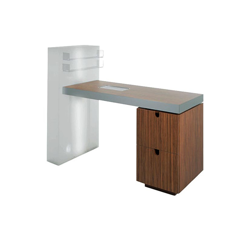 Стол для проведения маникюра с прямоугольной толстой столешницей и встроенной вытяжкой , со сменным фильтром (возможен вариант без вытяжки). Одна сторона стола оснащена тумбой с двумя выдвижными ящиками, другая - панелью из оргстекла с двумя полками и подсветкой. Используемый материал для маникюрного стола - ламинат в различной цветовой гамме.