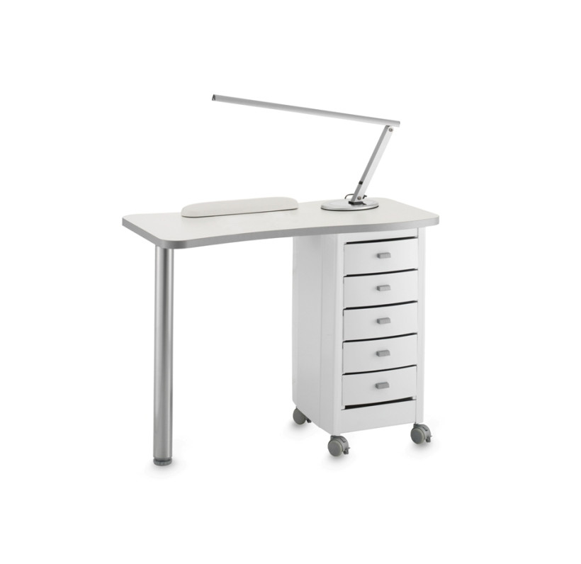 Маникюрный стол с одной тумбой, столешница из дерева, тумба из пластика. Кромка столешницы серого цвета. Опорная нога серая глянцевая. Тумба маникюрного стола оснащена пятью выдвижными ящиками и колесами со стопорами для удобства перемещения. В комплекте: валик маникюрный, подставка под лаки.