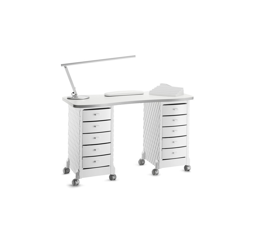 Маникюрный стол с двумя тумбами, столешница ламинированная, тумбы из прочного пластика с декоративной стеганой отделкой боковин. Тумбы маникюрного стола оснащены пятью выдвижными ящиками и колесами со стопорами для удобства перемещения. В комплекте: валик маникюрный, подставка под лаки.