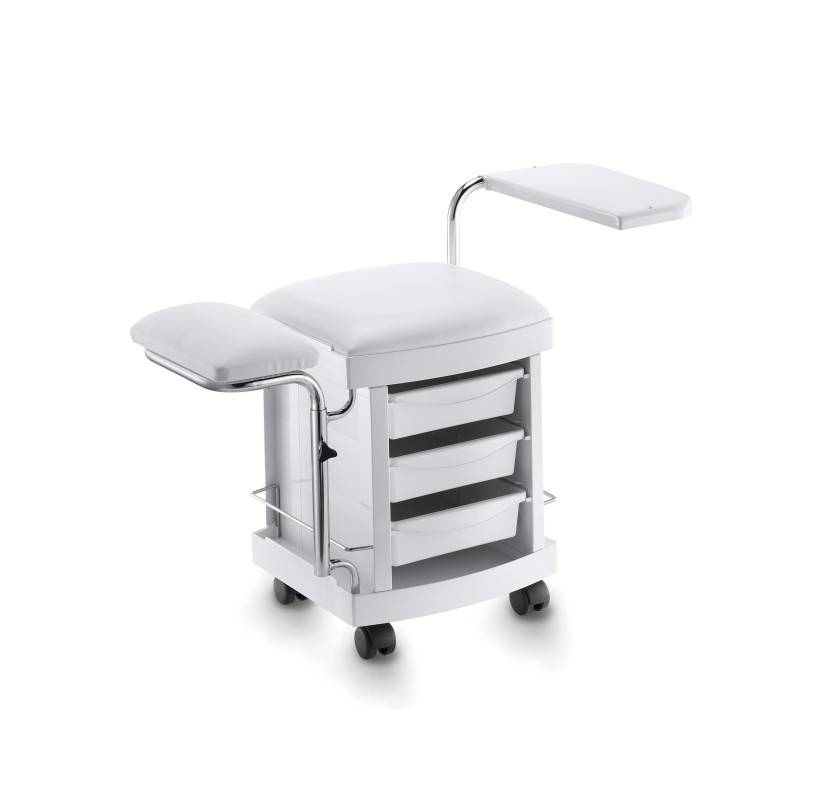 Универсальная экспресс-стойка для проведения процедур по маникюру-педикюру. Стойка оснащена колесиками для удобства перемещения, тремя выдвижными ящиками и специальными полочками которые регулируются по высоте. Каркас стойки выполнен из прочного пластика, мягкие элементы сиденья и 1 рабочей полочки выполнены из искусственной кожи высшего качества.