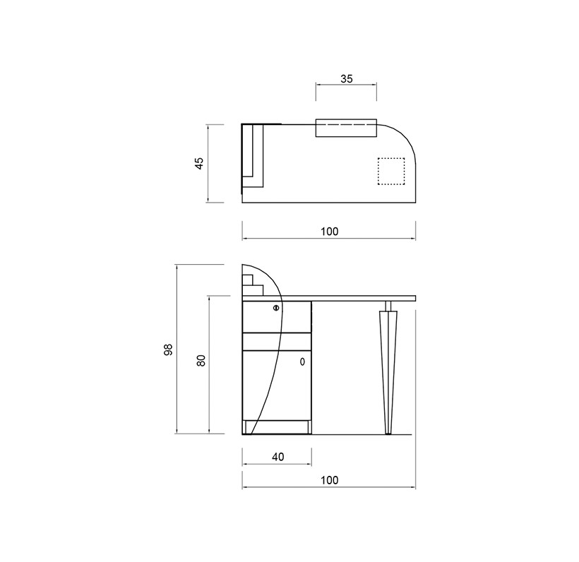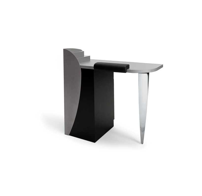 Маникюрный стол, выполнен из ламината и аллюминия, стол оснащен выдвижным ящиком и распашной дверцей, ножка из алюминия, с подставкой под лаки и валиком для рук.