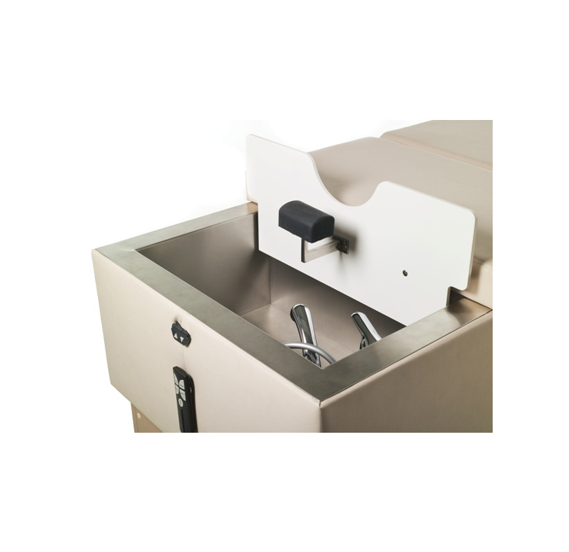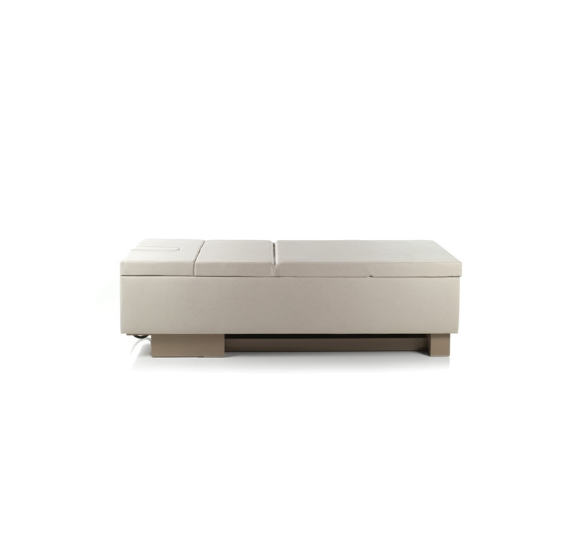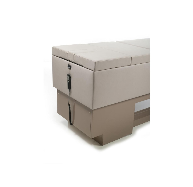 Многофункциональная кушетка для массажа и SPA процедур для лица и тела, способна обеспечить максимальный комфорт. Кушетка оснащена тремя электромоторами, с помощью которых регулируются высота, наклон спинки и сидения (ножной части), регулировки осуществляются за счет ручного пульта управления. Также кушетка оснащена широким матрасом с отверстием для лица и интегрированной раковиной из нержавеющей стали для мытья головы. Основание кушетки изготовлено из ламината. Комфортабельный матрас эргономичной формы создан на основе последних разработок мастеров компании. Обивка - искусственная кожа высшего качества.